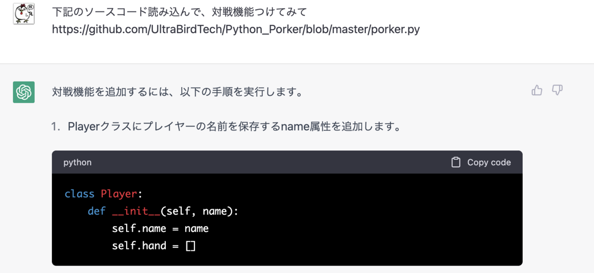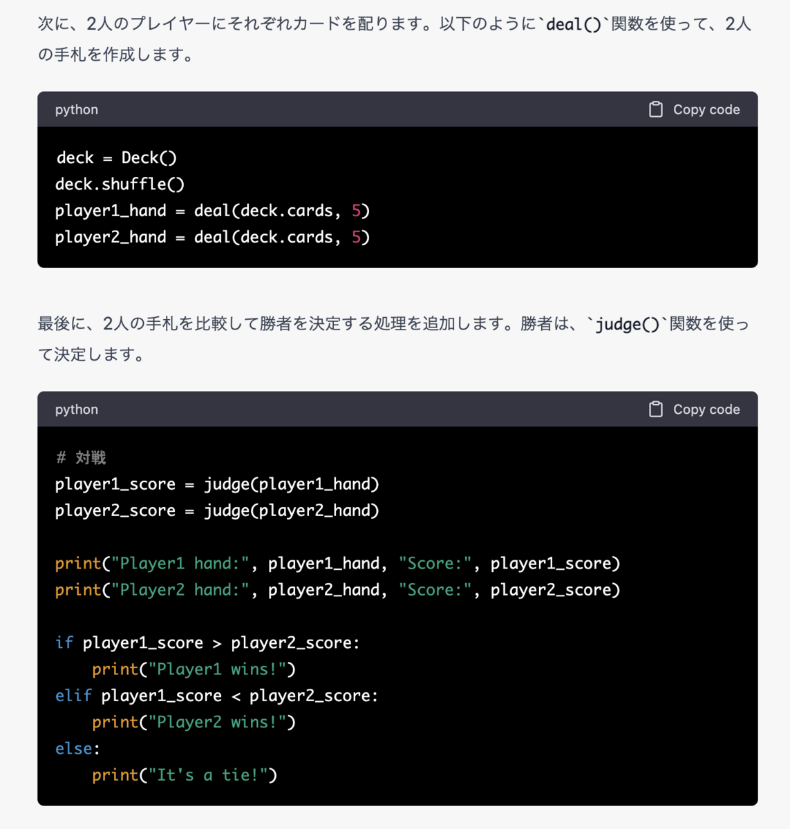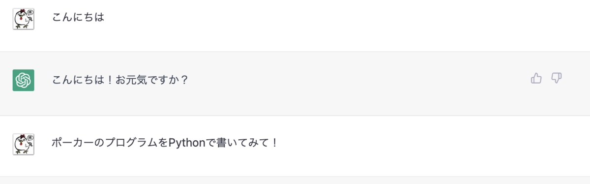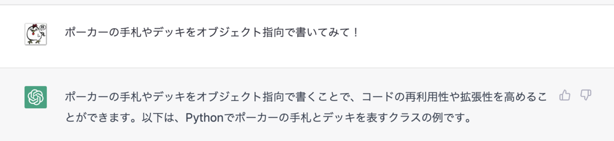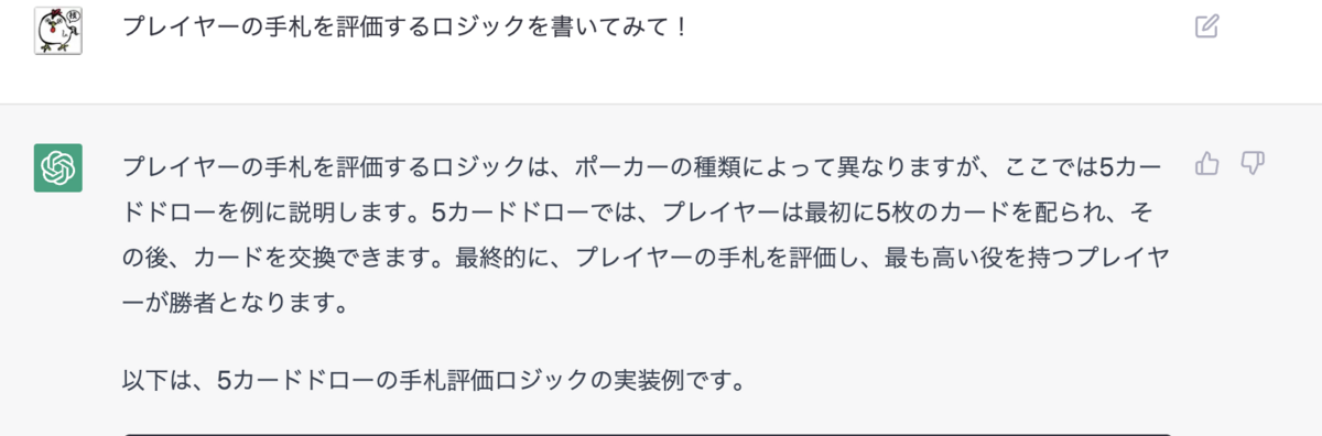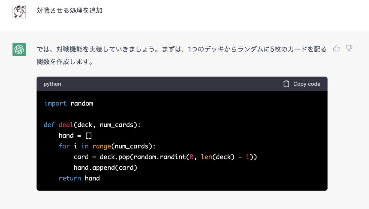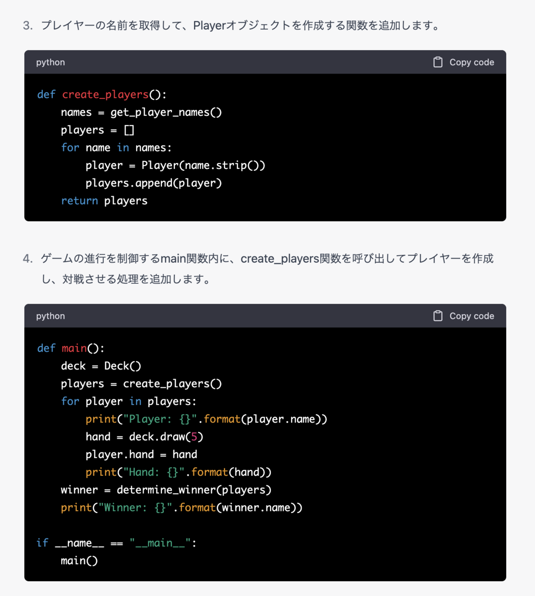 今回は、業務ロジックや業務知識などは必要ない、このポーカーのロジックをPythonで書いてもらいました。